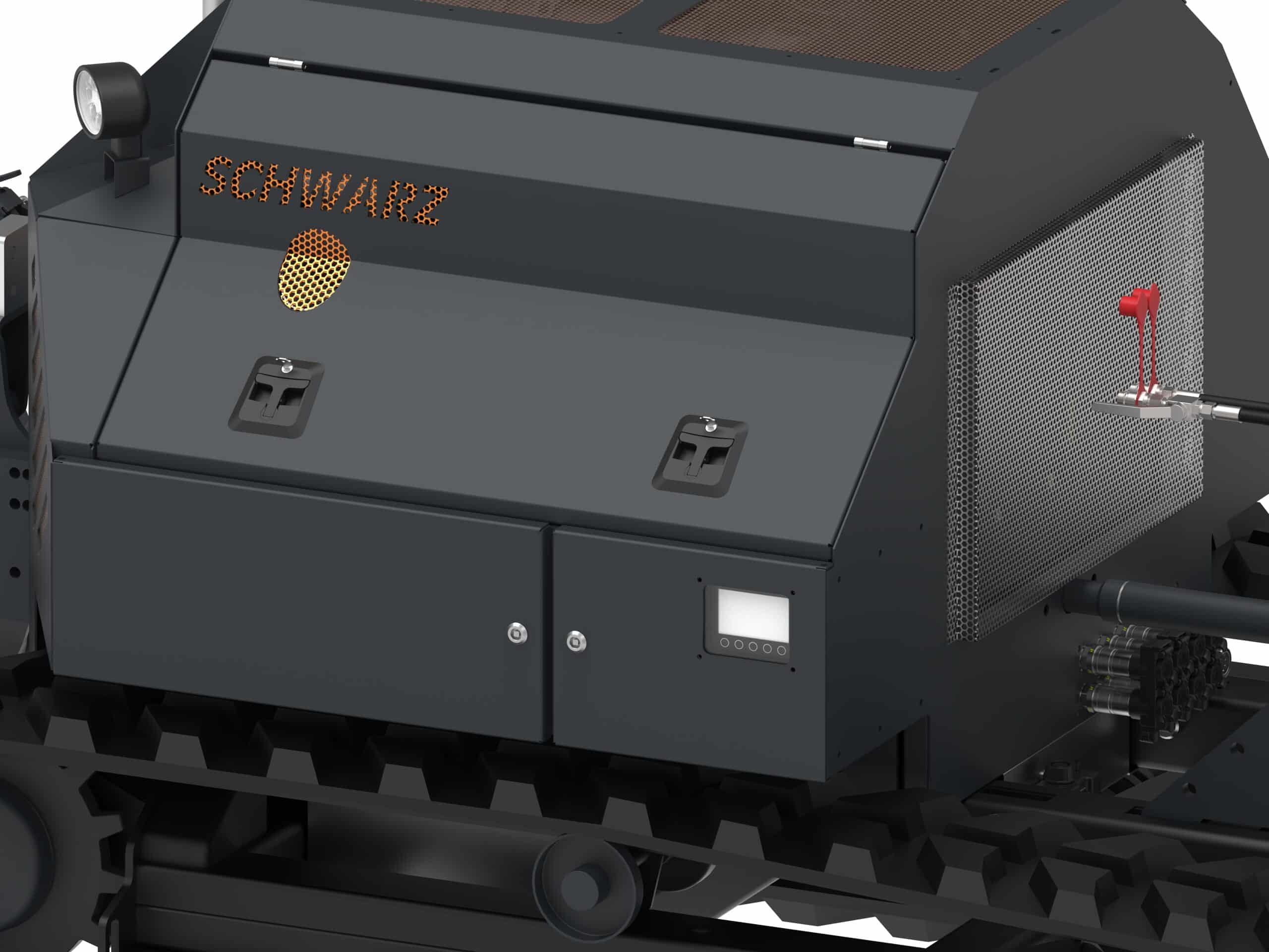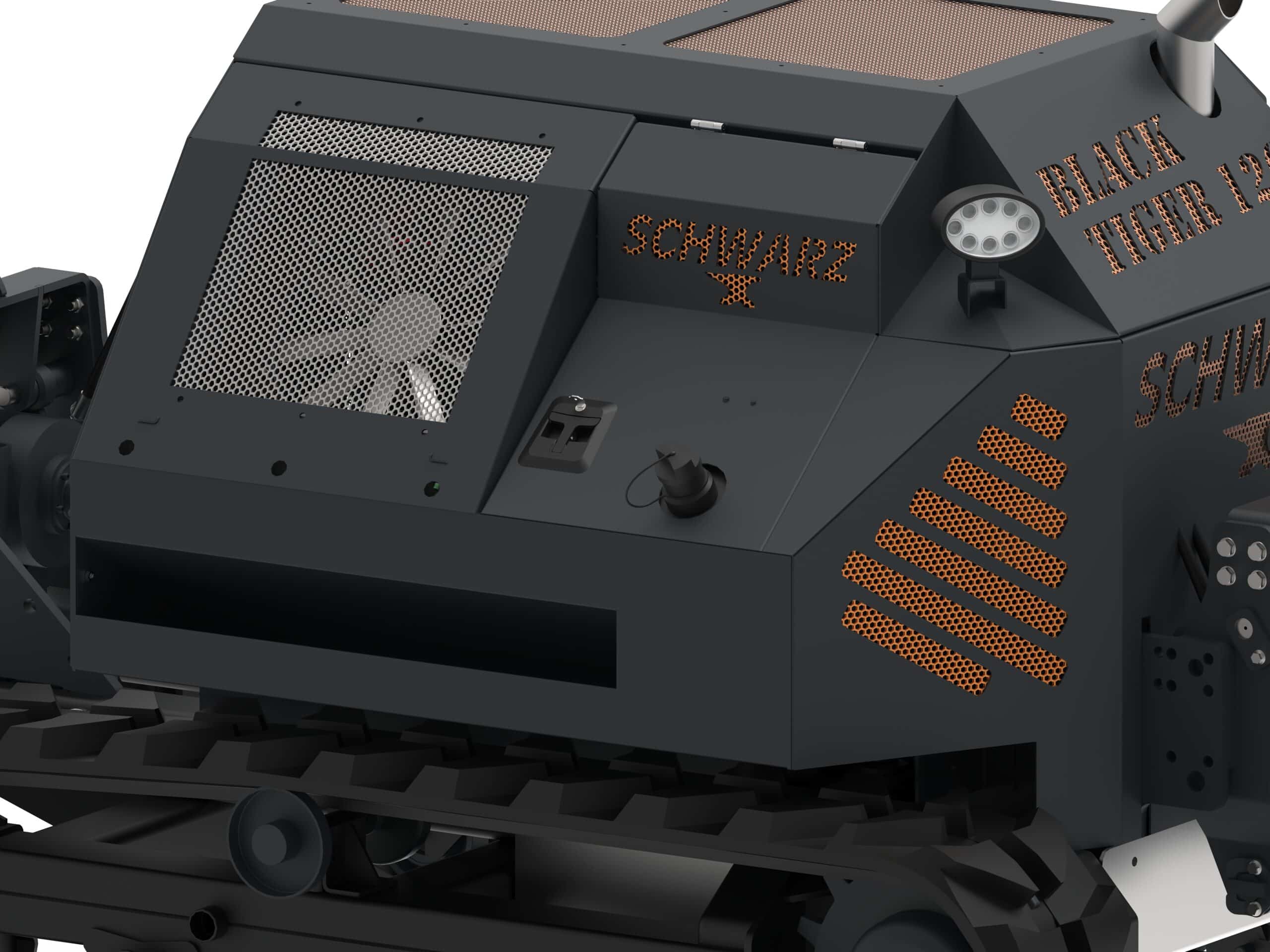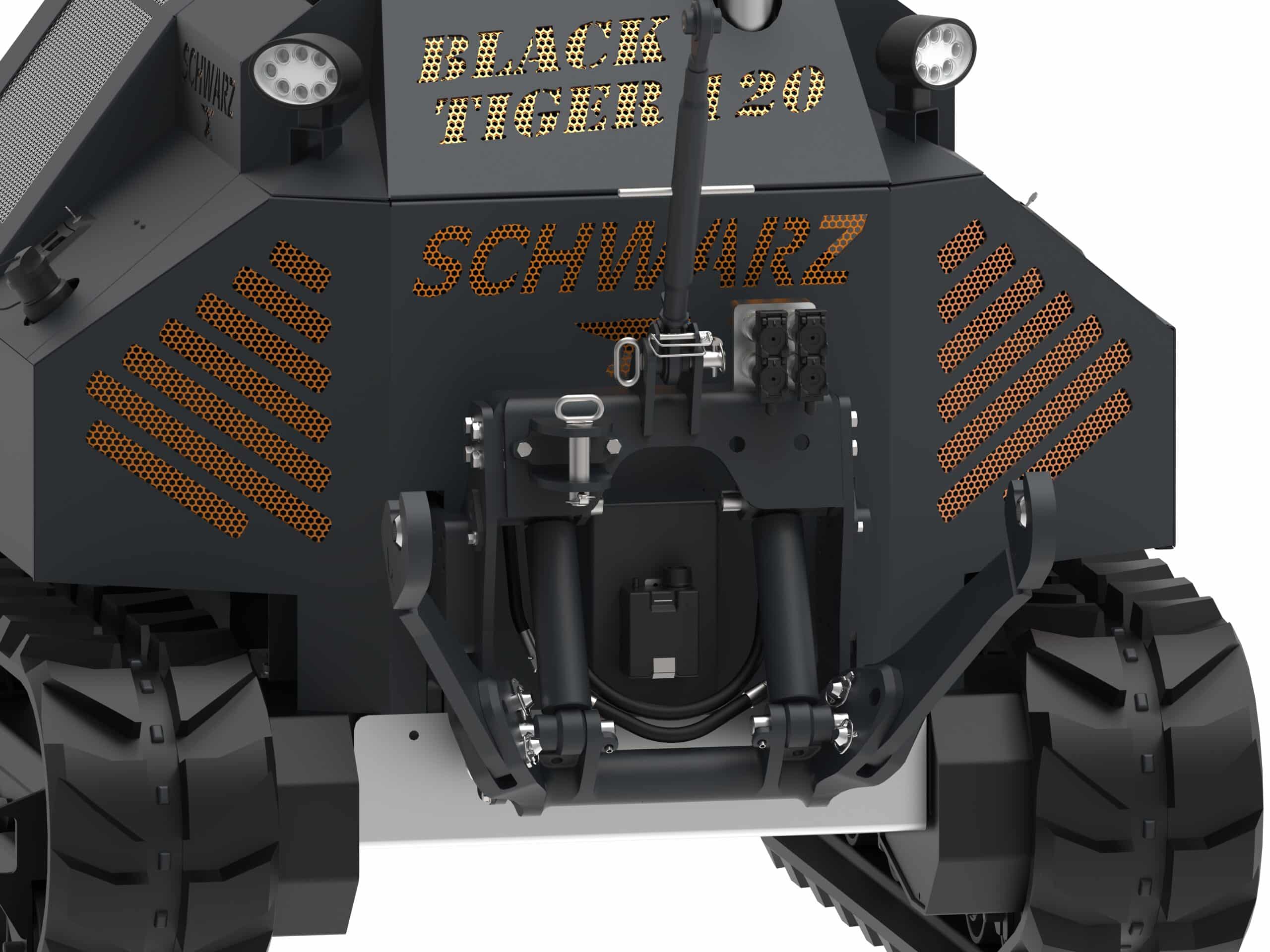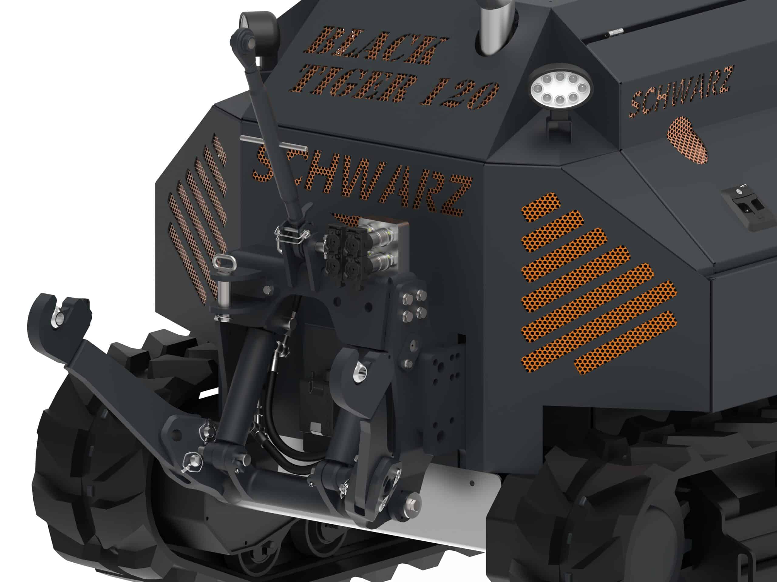 Die Forstraupe „Black Tiger 120“ ist mit ihren 90 KW/122 PS (500 Nm) ein wahres Kraftpaket, das in bis zu 40 Grad geneigtem Terrain für dich arbeitet. Der Antrieb der Anbaugeräte ist über Zapfwelle oder Hydraulik möglich und bietet dir ein 3-Punkt KAT II System mit 2,5 to Hubkraft (vorne und hinten). Zwei getrennte Hydrauliksysteme für Fahrantrieb und Leistungshydraulik sowie bis zu 6 doppelwirkende Steuergeräte stehen dir für die Arbeit mit der Forstraupe zur Verfügung. Mit der Funkfernbedienung bedienst du das 12 km/h schnelle Forstgerät aus sicherer Distanz.